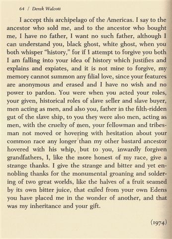 I accept this archipelago of the Americas. I say to the ancestor who sold me, and to the ancestor who bought me, I have no father, I want no such father, although I can understand you, black ghost, white ghost, when you both whisper "history," for if I attempt to forgive you both I am falling into your idea of history which justifies and explains and expiates, and it is not mine to forgive, my memory cannot summon any filial love, since your features are anonymous and erased and I have no wish and no power to pardon. You were when you acted your roles, your given, historical roles of slave seller and slave buyer, men acting as men, and also you, father in the filth-ridden gut of the slave ship, to you they were also men, acting as men, with the cruelty of men, your fellowman and tribesman not moved or hovering with hesitation about your common race any longer (than my other bastard ancestor hovered with his whip, but to you, inwardly forgiven grandfathers, I, like the more honest of my race, give a strange thanks. I give the strange and bitter and yet ennobling thanks for the monumental groaning and soldering of two great worlds, like the halves of a fruit seamed by its own bitter juice, that exiled from your own Edens you have placed me in the wonder of another, and that was my inheritance and your gift.