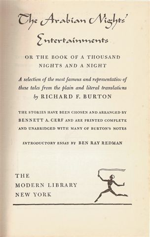 Burton, Richard F., trans. The Arabian Nights’ Entertainments, or The Book of the Thousand Nights and a Night: A Selection of the Most Famous and Representative of these Tales. Ed. Bennett A Cerf. 1932. Introductory Essay by Ben Ray Redman. New York: Modern Library, 1959.